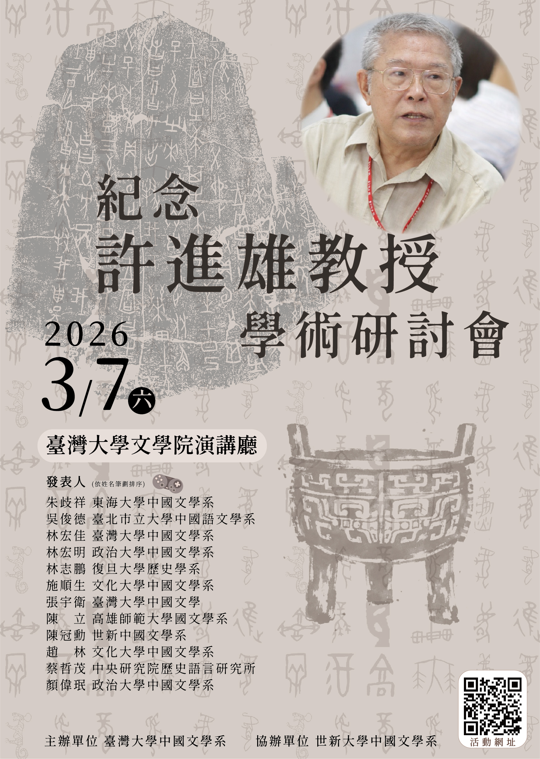 2026紀念許進雄教授學術研討會 2026-02-04 2026紀念許進雄教授學術研討會 時間:2026年3月7日(星期六) 地點:臺灣大學文學院演講廳 議程 報名網址 主辦單位:臺灣大學中國文學系 協辦單位:世新大學中國文學系 Category: 最新消息, 未分類 Tags: 最新消息